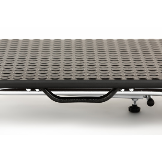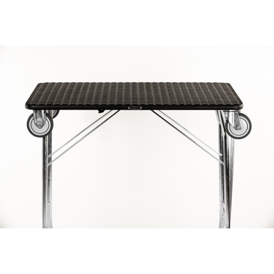 Vuoi comodamente sistemare il tuo amico a quattro zampe? Acquistate un tavolo per la toelettatura dei cani dotato di ruote in gomma, diametro 10 cm, montate su cuscinetti; il tavolo può essere facilmente e rapidamente smontato e montato come un carrello. La capacità di carico del tavolo è di 65 kg e quella del carrello è di 200 kg. Il carrello ha un timone telescopico per il traino lungo 55 - 106 cm. La superficie del tavolo è rivestita in gomma antiscivolo a monete, telaio in acciaio verniciato a polvere, prodotto in Italia. Peso ca. 15kg, altezza piegata 15cm e altezza del tavolo montato 79cm, dimensione del piano di lavoro 80*50cm.