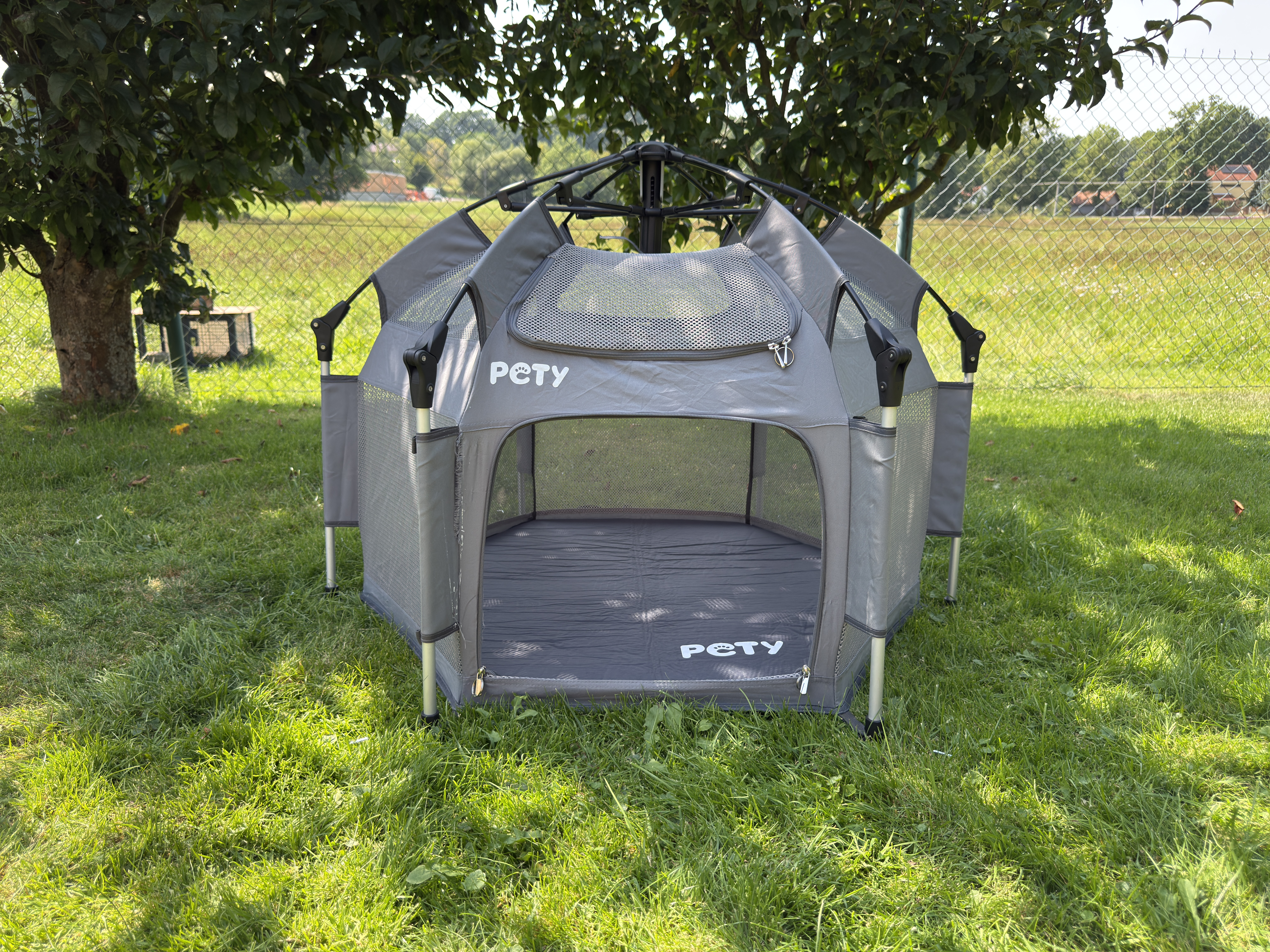 Massima sicurezza: il recinto PETY offre la massima sicurezza per il tuo animale domestico. Grazie alle pareti a rete, PETY è ottimamente ventilato e avrete sempre il vostro animale domestico sotto controllo. Progettato e brevettato in Svizzera. La scatola viene fornita in un involucro per il trasporto.
